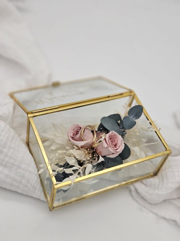 Mit einem edlen Goldfinish, das die Box in sanftem Glanz erstrahlen lässt, wird sie zu einem wahren Highlight bei Eurer Trauung. Befüllt mit zarten stabilisierten Trockenblumen, die für ewige Schönheit und Beständigkeit stehen, wird diese Box Eure Ringe auf elegante Weise präsentieren.